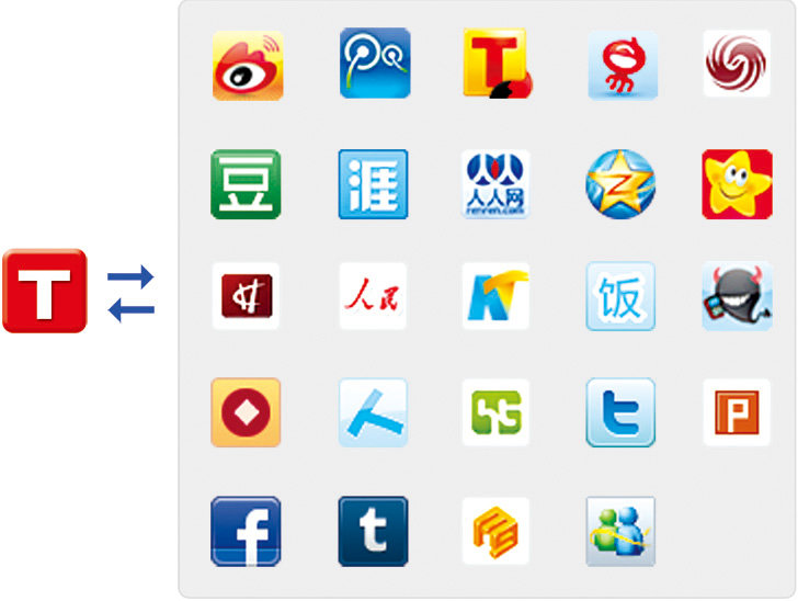 撐持:新浪微博、騰訊微博、搜狐微博、網易微博、飯否、海角微博、國民微博、新華微博、豆瓣、鳳凰微博、QQ空間、高興網大家網、和訊微博、挪動微博、嘀咕社區、 中金微博等20多家微博及SNS網站;(若有變化,請按體系可綁定的平臺為準)